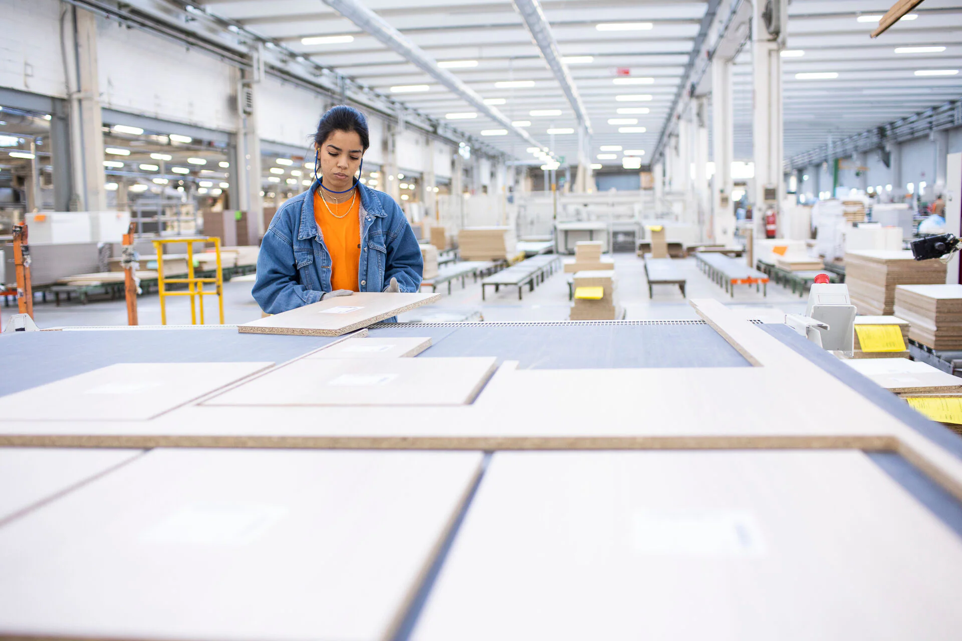In the nesting cell unloading area, a female operator (and it is worth pointing out that there are numerous women in production at the Estel factory) performs a first re-organisation of the pieces based on the relative orders.