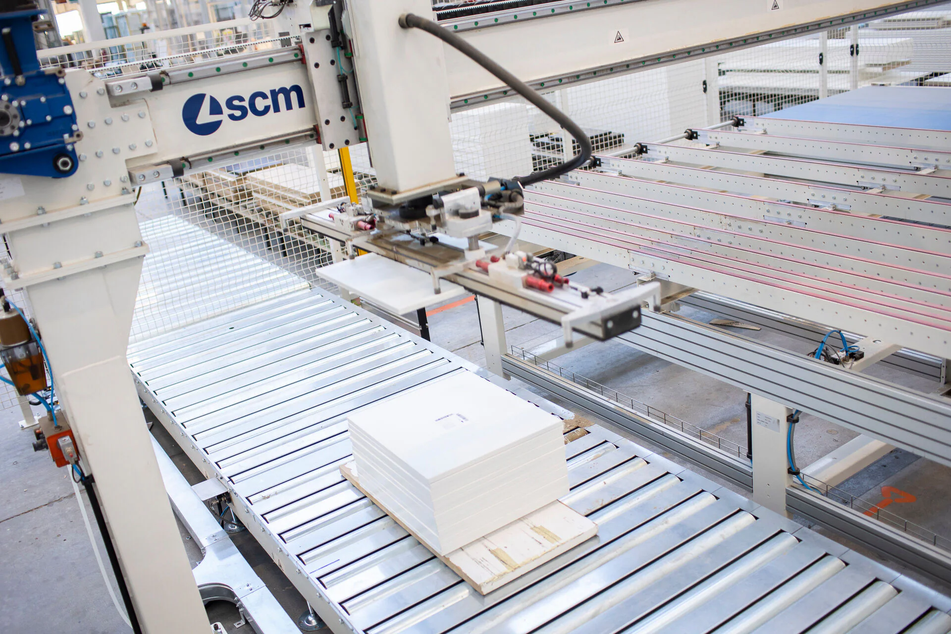 The panels are then introduced into the "stefani cell H" edgebanding cell. This is also a highly evolved solution, designed by SCM for a highly flexible "batch 1" industrial production. The cell has an automatic loading and Pickfeed recirculation bridge that simplifies the handling of mixed stacks with pieces that differ from one another and a Pickback panel return system complete with automatic unloading.