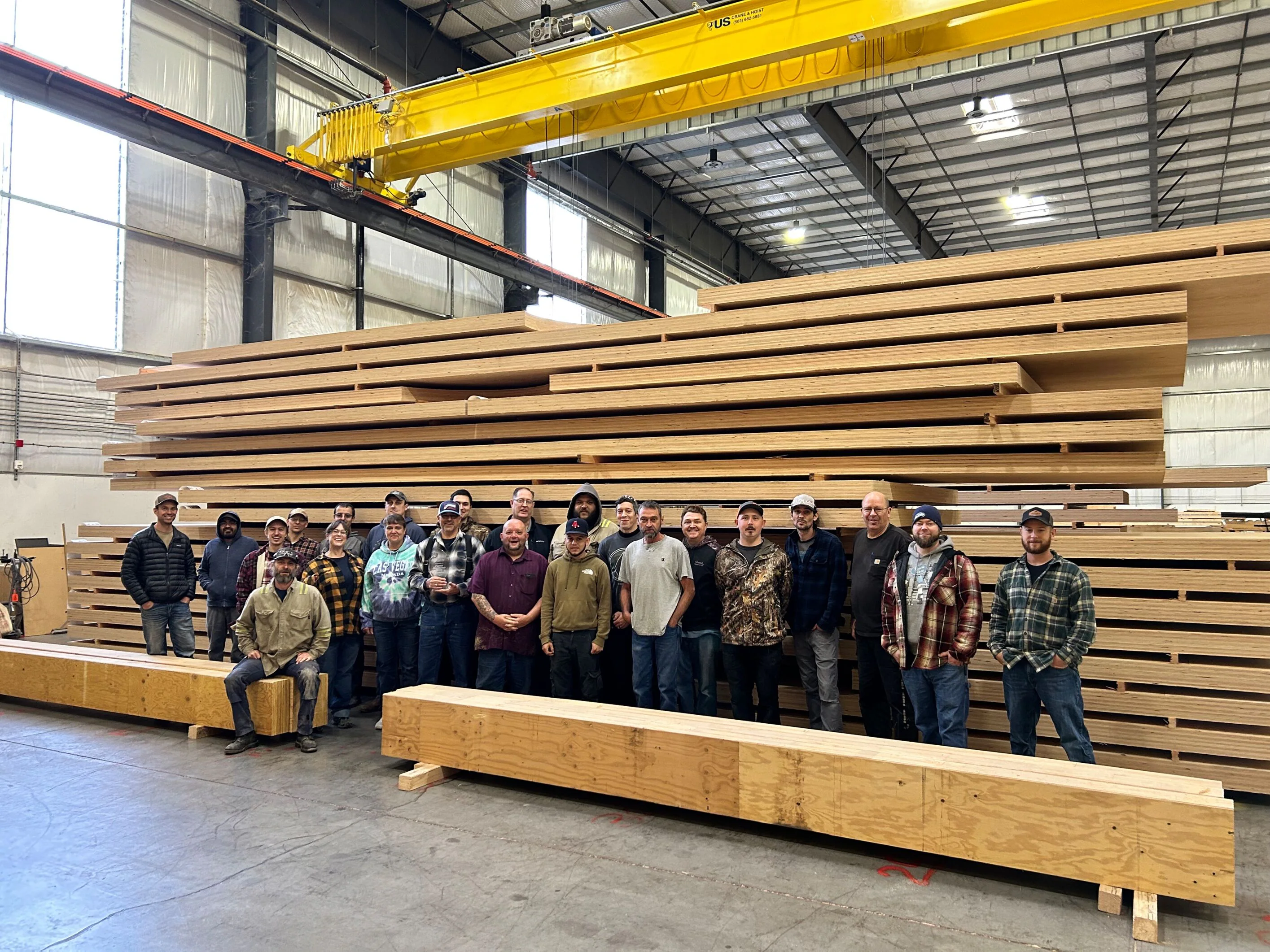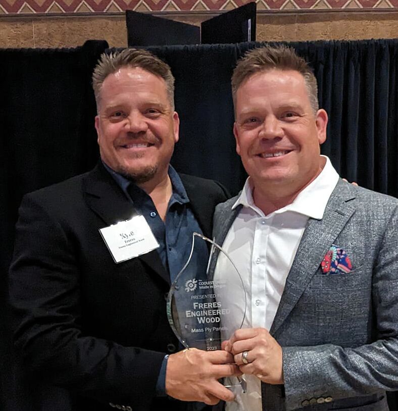 “Mass Ply products are patented, veneer-based, engineered wood products that provide superior performance characteristics over mass timber products such as CLT, Glulam beams, and solid sawn lumber” states the company in describing their core business. “The building block of each Mass Ply Product is Freres Structural Composite Lumber (SCL), which consists of multiple layers of density-graded Douglas Fir veneers. These veneers are glued and pressed in a variety of combinations and orientations, and finally joined together to create 1” layers (called lamellas)”.