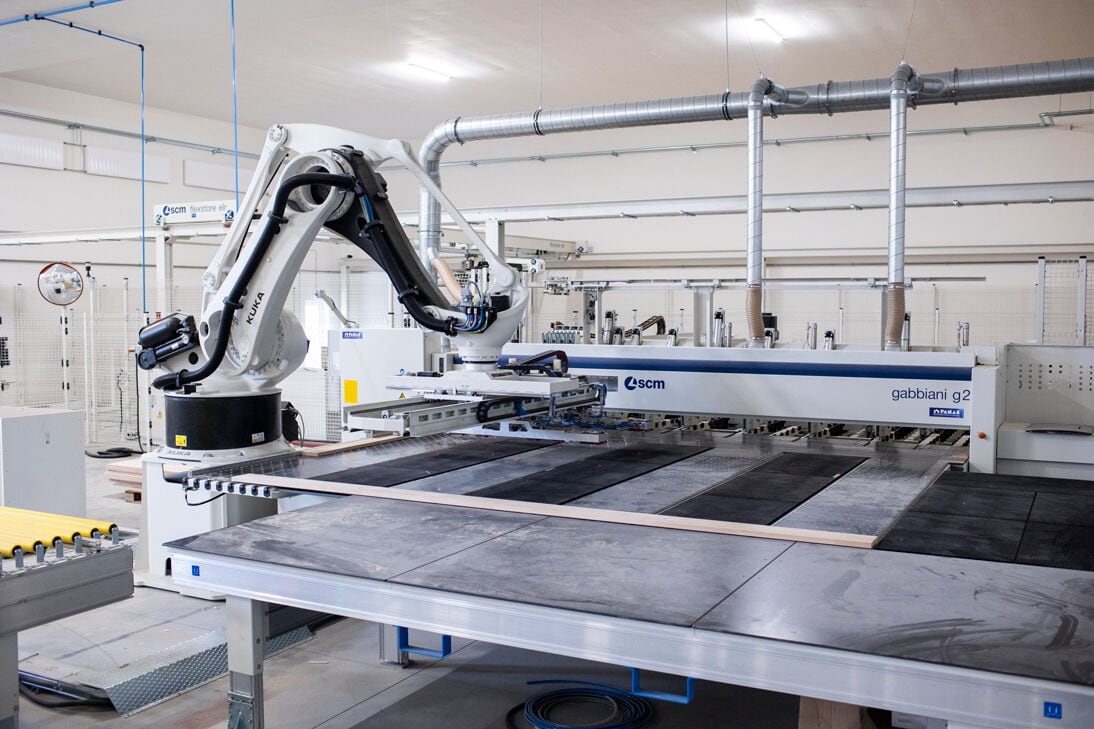 Intermont also has a number of “accord 500” CNC machining centres, these too integrated by articulate robots. These systems produce solid wood elements, so suitable for all machining work that requires a large amount of removal, maintaining a high standard of precision and finishing. Hand in hand with the technical advantages that mark these SCM machines, like the 5-axis groups with high precision and speed, is the further efficiency guaranteed by the robots.