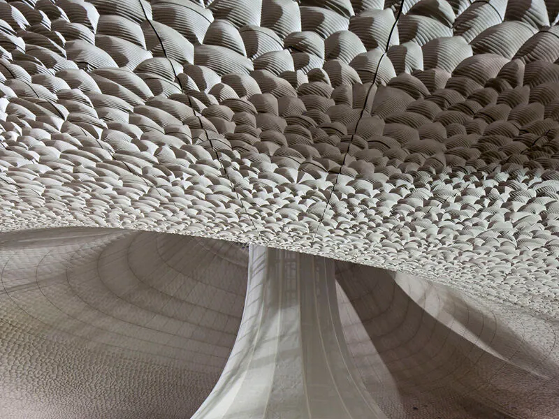 Subsequently macros were created to machine both sides of the glued plaster fibre panels. The routing depth of the surface structure, consisting of almost 1,000,000 irregular cavities, ranged from 5 mm to 90 mm. 30,520 CNC programs with 352,000,000 characters were needed for the almost 1.5 million linear metres of routing. Over 1000 diamond cutters were used in 5000 sharpening cycles.