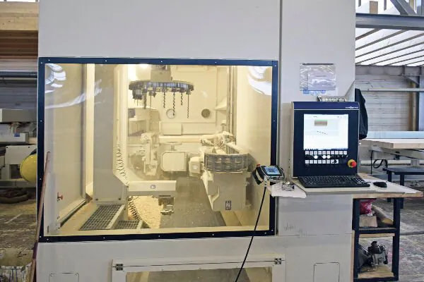 For many years, in fact, in addition to its classic range, the company also offers custom-cutting operations with a madeto-measure approach right from the start of production. When the strips are glued, in fact, the beams are positioned nearly in their definitive format in order to reduce rejects and optimize the use of the wood. At the beginning of 2017, Euro Lamellé also added an internal cutting service, thanks to an investment in an SCM oikos 6-axes CNC machining centre. Fitted with a 15-position tool changeover system, this machining centre includes a chain-driven router and saw that can process any straight workpiece measuring up to 1.25 m wide and 19 m long.
