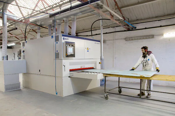 That’s perfect for our kind of work because we want to retain the texture. With our metallic panels, we want to clean a couple of millimetres of relief, so we put two longitudinal brushes on. The pad sanders then go into the crevices and bring out the grit, polishing the interior and the top so the product is much cleaner than we could ever have achieved by hand with a blue wheel and drill. Two passes and it’s a million times better than we could ever do it. “We had the machine specially widened to 1650mm to cope with our larger panels and opted for the heaviest calibration system we could get on the wider machine.