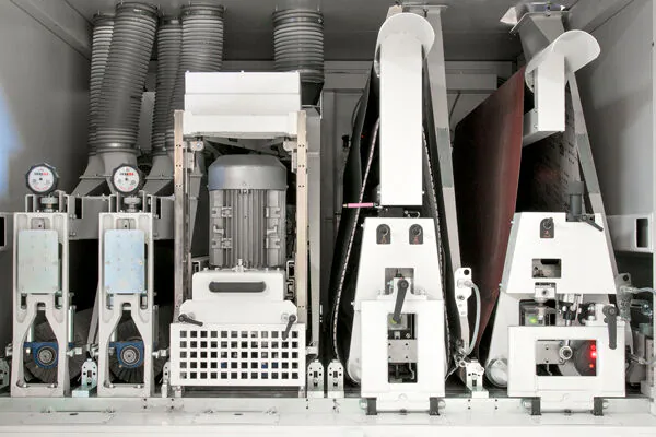 With the dmc, the calibration roller can lift and become a pad sander and we also decided on a superfinishing unit. We have planetary sanders that can be brushes or sanding discs. The spongy pads don’t put too much pressure on the material and they ride the surface rather than making it totally flat.