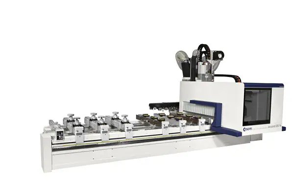 Accord 25 FX is the machining centre that offers high-tech solutions and ease of use with a relatively small investment, ideal for small and medium-sized companies producing doors, windows, stairs and solid wood furniture. Equipped with the Matic fully automatic worktable, the Prisma 5-axis machining head and the Pro-Speed safety system, it allows a complete machining of the workpiece while requiring far shorter times for set-ups and tool changes, thus optimising productivity.