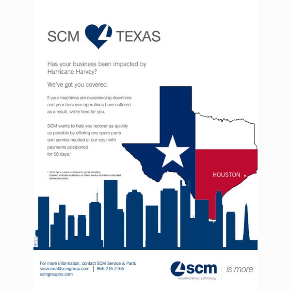 Has your business been impacted by Hurricane Harvey? We’ve got you covered. If your machines are experiencing downtime and your business operations have suffered as a result, we’re here for you. SCM wants to help you recover as quickly as possible by offering any spare parts and service needed at our cost with payments postponed for 60 days.
