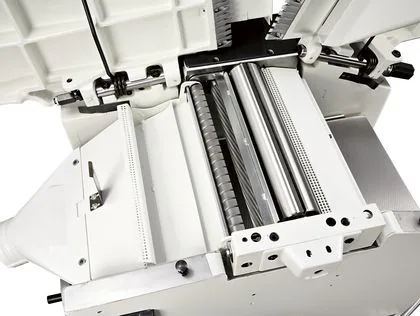 The planer unit stands on cast iron supports and the standard version has a 87 mm diameter cutter block with 3 knives. (The optional “Tersa” cutter block is available with 4 quick tightening knives and automatic adjustment). For an impeccable finish, the pressureof the thicknesser feed rollers can be adjusted according to the type of wood machined. The infeed roller has a helicoidal profile to guarantee firm and constant work piece feed, while the outfeed roller, in sandblasted steel, maintains the perfect post-processing finishing.