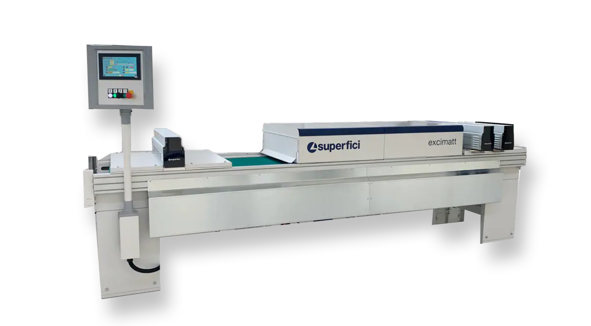 L’irradiazione a 172 nm creata dalla lampada ad eccimeri modifica strutturalmente lo strato superficiale di vernice e di inchiostro da applicare. Si possono ottenere effetti di sorprendente morbidezza con un elevato grado di opacità e con valori di gloss estremamente bassi. Il sistema permette finiture superficiali ricercate soprattutto nella stampa luxury e packaging. In una linea di stampa questa tecnologia è composta dalla sola lampada ad eccimeri montata in una camera inerte, mentre in una linea di finitura separata potrà essere composta da un pre-trattamento, camera inerte, lampada ad eccimeri e lampade UV per la polimerizzazione finale.