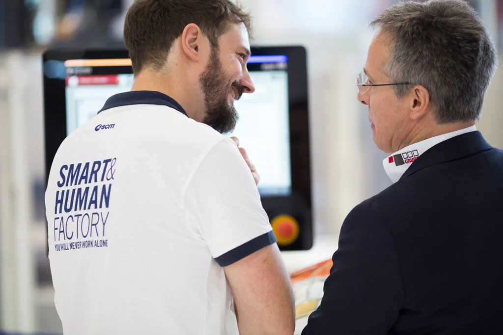 As far as contacts and business opportunities are concerned, Ligna 2019 was a great success for SCM. As the trade fair comes to an end, Ligna once again proves to be a top quality international event, with more than 90 thousand visitors, according to the organisers, from more than one hundred countries. The most important companies in the woodworking sector and active on all the key, essential international markets, hastened to the trade fair in Hanover to discover what was new in the industry. One of these new entries was the Smart&Human Factory which took centre stage at SCM's bright, elegant stand and was a key attraction. On the crest of the concept wave "You will never work alone" that proves the Group's unique strength as a partner always ready to accompany and support its clients with the most advanced technologies, SCM's digital factory has shown how human work can be integrated with that of industrial, collaborative robots in state of the art cells that are open and safe, to relieve operators of low added value jobs and allow them to focus on supervising the production process.