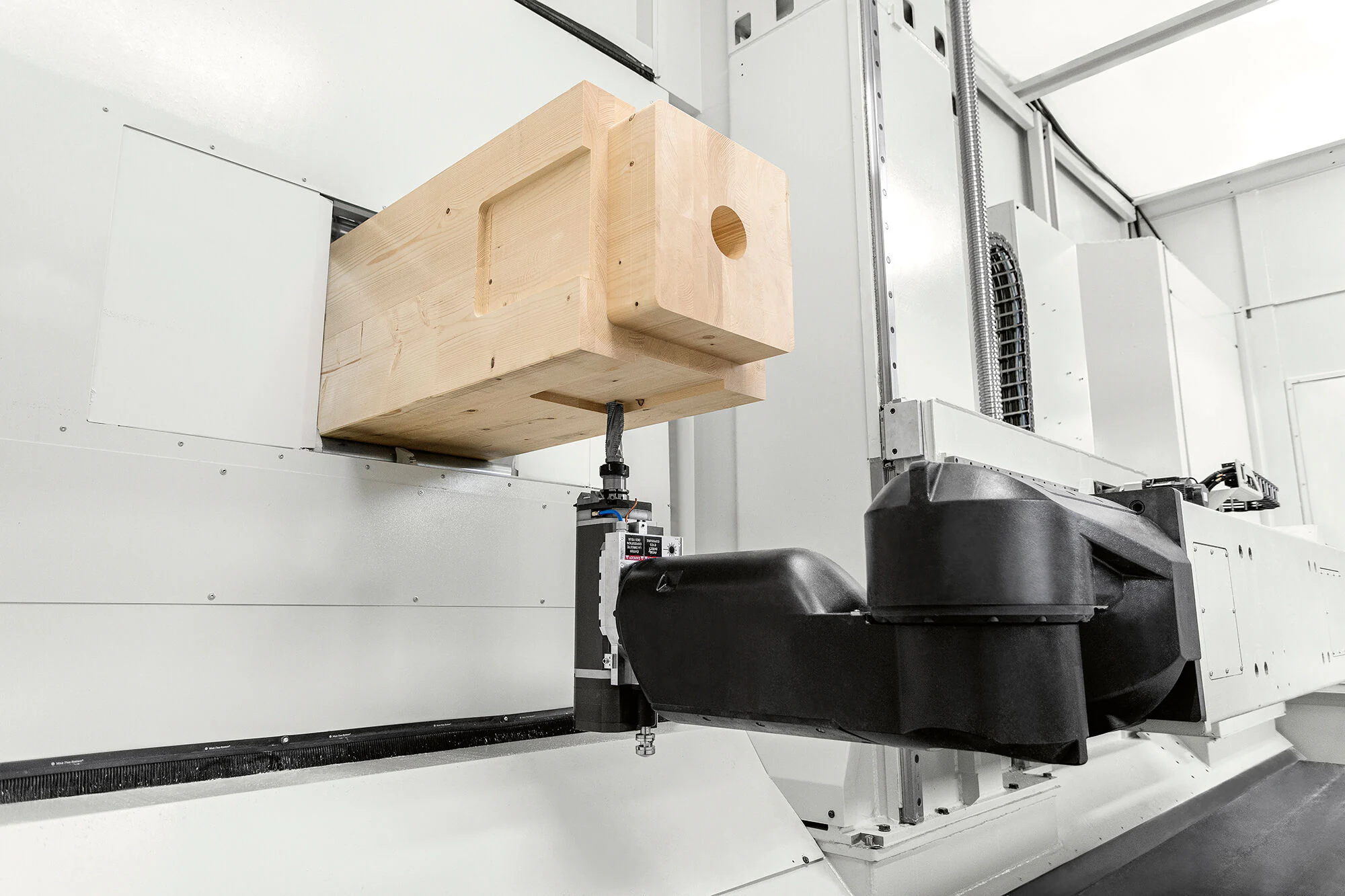 SCM AREA zainstalowane w firmie Jagram-Pro to 5-osiowe centrum obróbcze CNC z ruchomą bramą i modułową konstrukcją pozwalającą na obróbkę dużych elementów konstrukcji drewnianych, takich jak kompletne ściany z paneli CLT, belki konstrukcyjne czy elementy krzywoliniowe.