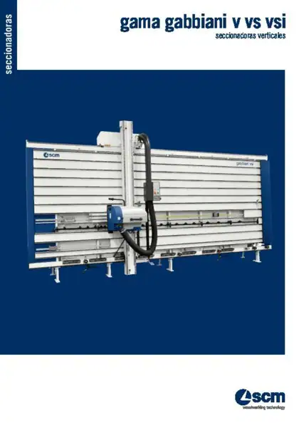 Vertical panel saw with independent motors for main blade and scorer with mechanical plunging designed to make horizontal and vertical cuts on different types of wood materials.
